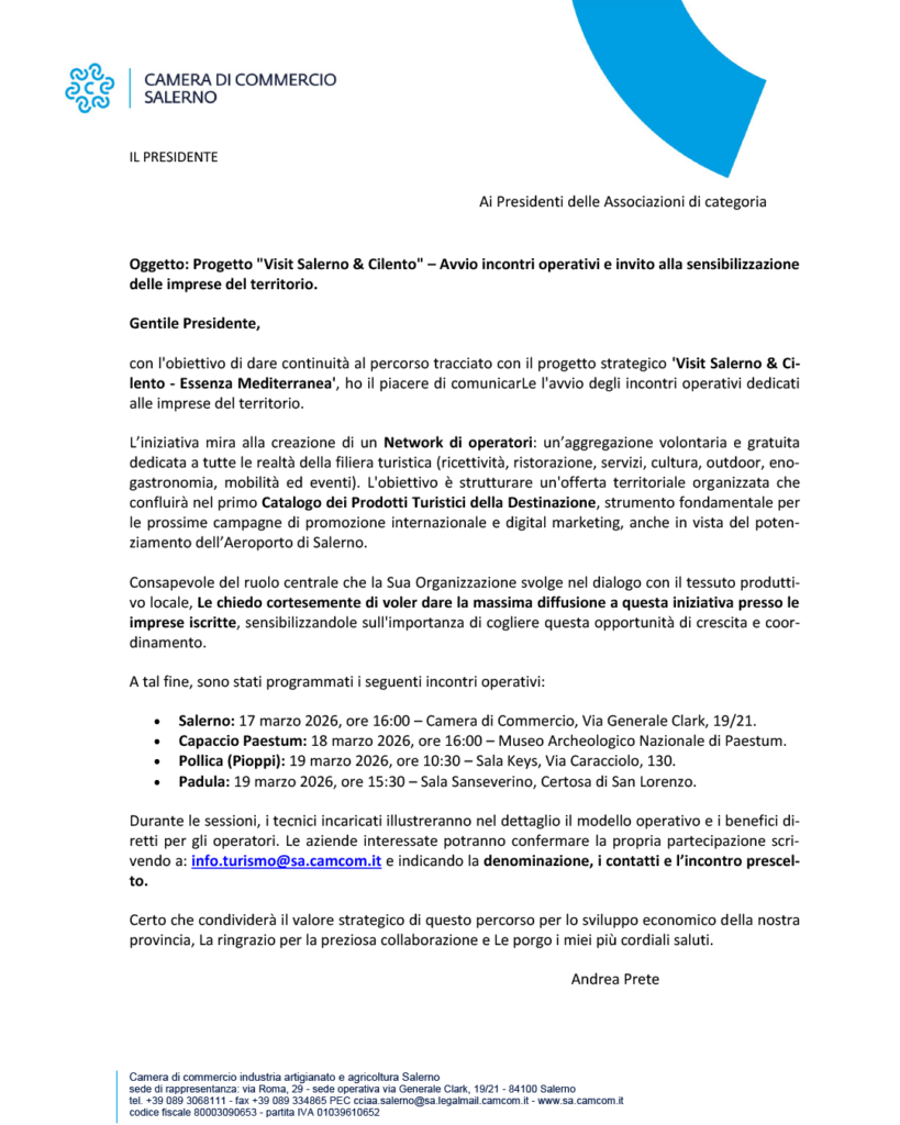 In questo contesto, la Camera di Commercio lancia il nuovo Network di operatori turistici nell’ambito del progetto “Essenza Mediterranea”. L’iniziativa, gratuita, mira a strutturare l’offerta territoriale e a realizzare il primo Catalogo dei Prodotti Turistici della Destinazione, intercettando i flussi internazionali legati all’Aeroporto di Salerno.
