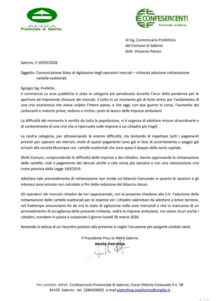 Stato di agitazione per gli operatori dei mercati cittadini di Salerno. A comunicarlo, con una lettera indirizzata al Commissario prefettizio, è Aniello Pietrofesa, presidente provinciale ANVA Confesercenti Salerno, che chiede l’adozione urgente della rottamazione delle cartelle esattoriali.