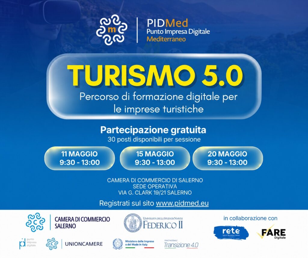 Per rispondere a questa sfida nasce “Turismo 5.0”, un percorso di formazione digitale pensato per le imprese turistiche della provincia di Salerno. L’iniziativa prevede tre incontri pratici e gratuiti, con l’obiettivo di fornire strumenti concreti per affrontare la trasformazione digitale del settore.